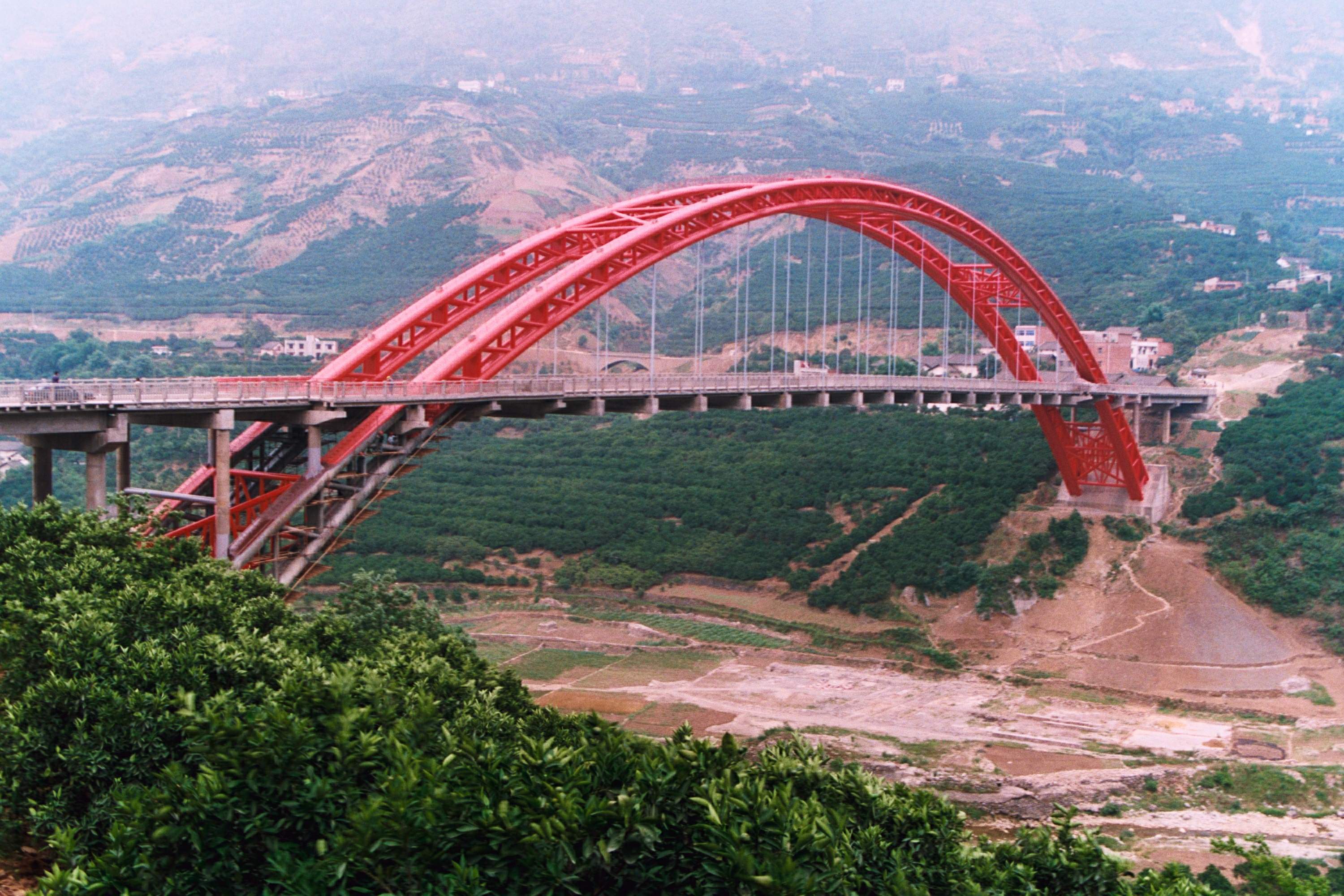 秭歸龍?zhí)逗哟髽蛭挥谥闹袊毘戎l(xiāng)----湖北秭歸縣腹地,主跨為208米的特大跨徑中承式鋼管混凝土拱橋,該橋在國內(nèi)首次采用“大跨徑鋼管砼拱橋纜索吊裝塔架扣架一體化施工,獲湖北省科技進步二等獎,于2000年建成。