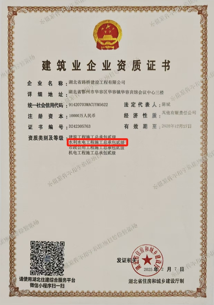 近日,經湖北省住房和城鄉(xiāng)建設廳核準審批,湖北省路橋建設工程有限公司成功取得水利水電工程施工總承包貳級資質。這一成果有效完善了公司資質體系,不僅是對公司在水利水電建設領域專業(yè)實力和技術水平的權威認可,更為公司在該領域的市場準入提供了堅實的基礎支撐,標志著湖北省路橋建設工程有限公司可獨立承接水利水電工程。