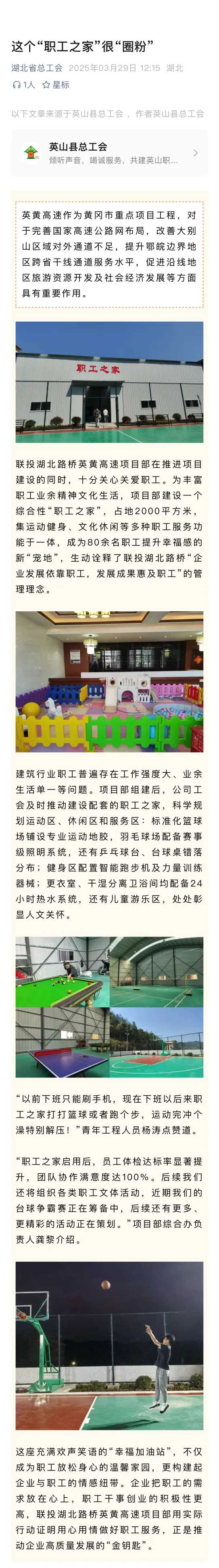 聯(lián)投湖北路橋英黃高速項(xiàng)目部在推進(jìn)項(xiàng)目建設(shè)的同時(shí),十分關(guān)心關(guān)愛(ài)職工。為豐富職工業(yè)余精神文化生活,項(xiàng)目部建設(shè)一個(gè)綜合性“職工之家”,占地2000平方米,集運(yùn)動(dòng)健身、文化休閑等多種職工服務(wù)功能于一體,成為80余名職工提升幸福感的新“寵地”,生動(dòng)詮釋了聯(lián)投湖北路橋“企業(yè)發(fā)展依靠職工,發(fā)展成果惠及職工”的管理理念。近日,湖北省總工會(huì)進(jìn)行深入報(bào)道,全文如下: