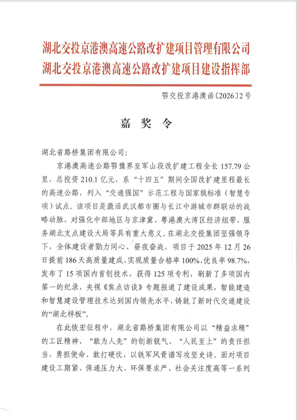 京港澳改擴建項目指揮部對湖北路橋京港澳改擴建1標(biāo)項目建設(shè)中做出的突出貢獻予以通令嘉獎。該項目是“十四五”期間全國改擴建里程最長的“交通強國”示范工程,對激活武漢都市圈與長江中游城市群聯(lián)動的戰(zhàn)略動脈,對強化中部地區(qū)與京津冀、粵港澳大灣區(qū)經(jīng)濟紐帶,服務(wù)湖北支點建設(shè)具有重大意義。項目建設(shè)期間,湖北路橋圓滿出色完成建設(shè)任務(wù),成功鑄就新時代交通建設(shè)“湖北樣板”。