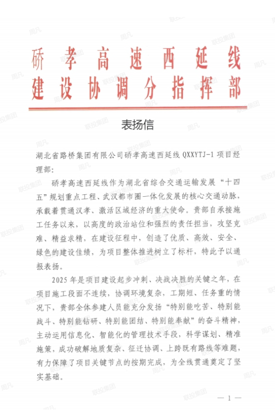 硚孝高速西延線建設(shè)協(xié)調(diào)分指揮部向湖北路橋硚孝高速西延線QXXYTJ-1項目經(jīng)理部發(fā)來表揚信,對該項目部在建設(shè)中所取得的突出成績予以高度肯定。