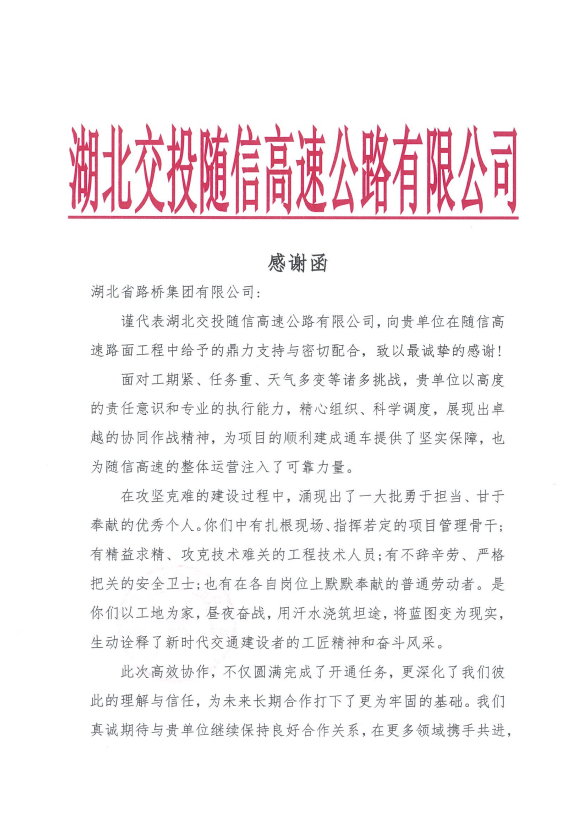 隨信路面項目收到項目辦發(fā)來的感謝函。該項目是湖北省綜合交通運輸發(fā)展“十四五”規(guī)劃中的重點工程。自項目建設(shè)以來,面對工期緊、任務(wù)重、天氣多變等諸多挑戰(zhàn),隨信路面項目團隊以高度責(zé)任與使命擔(dān)當(dāng)為引領(lǐng),精密組織、科學(xué)調(diào)動,嚴(yán)守質(zhì)量安全底線,圓滿實現(xiàn)全長45公里瀝青路面全線貫通,為區(qū)域交通網(wǎng)絡(luò)完善及沿線經(jīng)濟社會發(fā)展注入路橋力量!