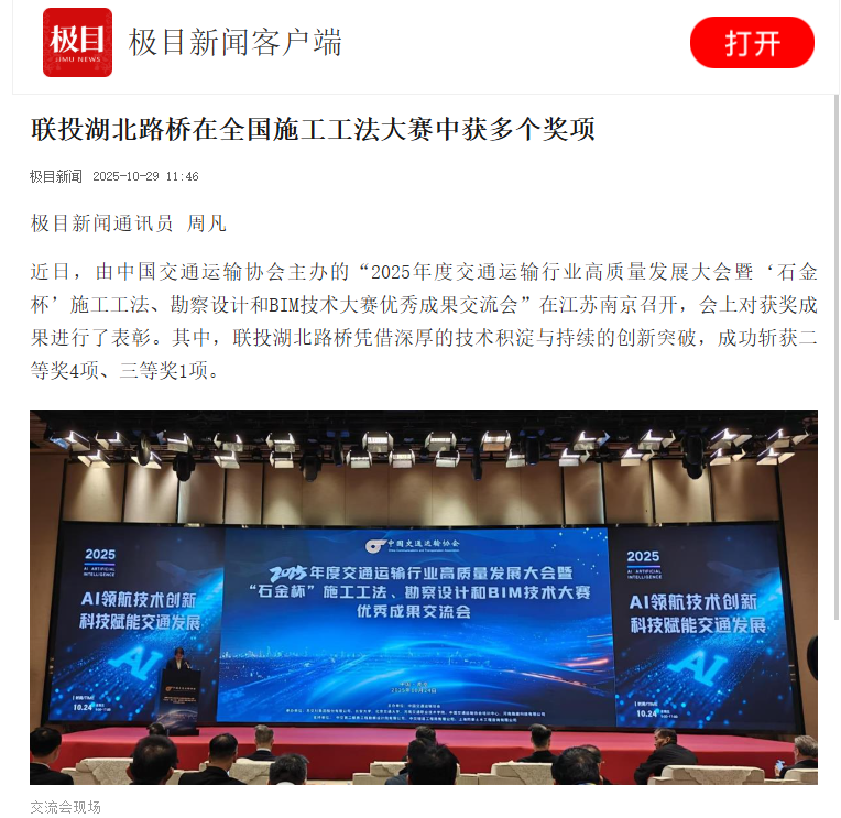 近日,由中國(guó)交通運(yùn)輸協(xié)會(huì)主辦的“2025年度交通運(yùn)輸行業(yè)高質(zhì)量發(fā)展大會(huì)暨‘石金杯’施工工法、勘察設(shè)計(jì)和BIM技術(shù)大賽優(yōu)秀成果交流會(huì)”在江蘇南京召開,聯(lián)投湖北路橋榮獲多個(gè)獎(jiǎng)項(xiàng),極目新聞對(duì)此事件進(jìn)行報(bào)道,以下是報(bào)道全文: