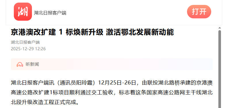 近日,聯(lián)投湖北路橋京港澳高速公路改擴建1標項目順利通過交工驗收,湖北日報對這一重大節(jié)點進行報道,以下是報道全文: