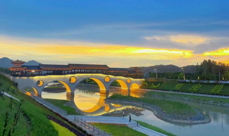 西河拱橋位于老西河拱橋北面,全長106m,采用27+37+27m上承式鋼筋混凝土拱橋結構,橋拱采用古風古韻的風雨廊橋造型,與房縣《詩經(jīng)》文化遙相呼應。